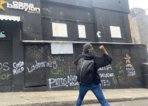 Protestas frente a la Casa Babylon en Bogotá, tras confirmarse la cancelación del evento Jamming Festival 2022 – Créditos: Natalia Prieto